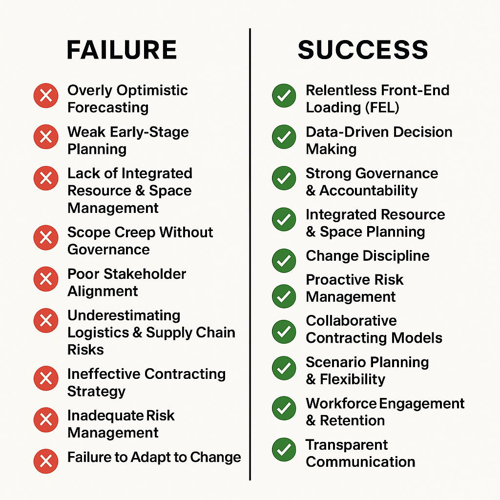 Relentless Front-End Loading (FEL) – Heavy investment in early planning, scenario modelling, and alignment.