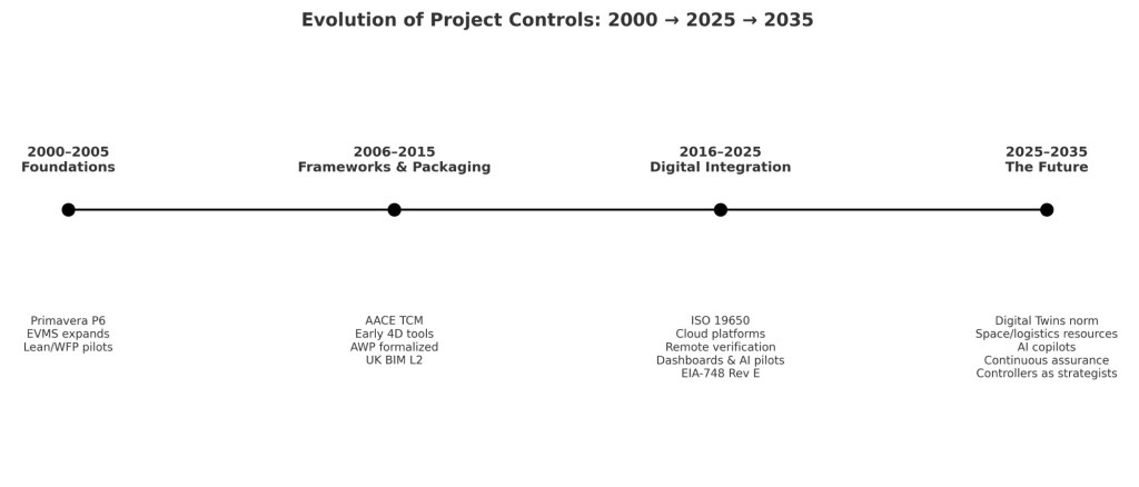 2000s โ Schedules in Primavera P6, EVMS compliance, siloed data. 2010s โ AWP formalized, BIM mandates, ISO 19650 standards, cloud platforms. 2020s โ Pandemic drives remote verification, dashboards, and early AI pilots.