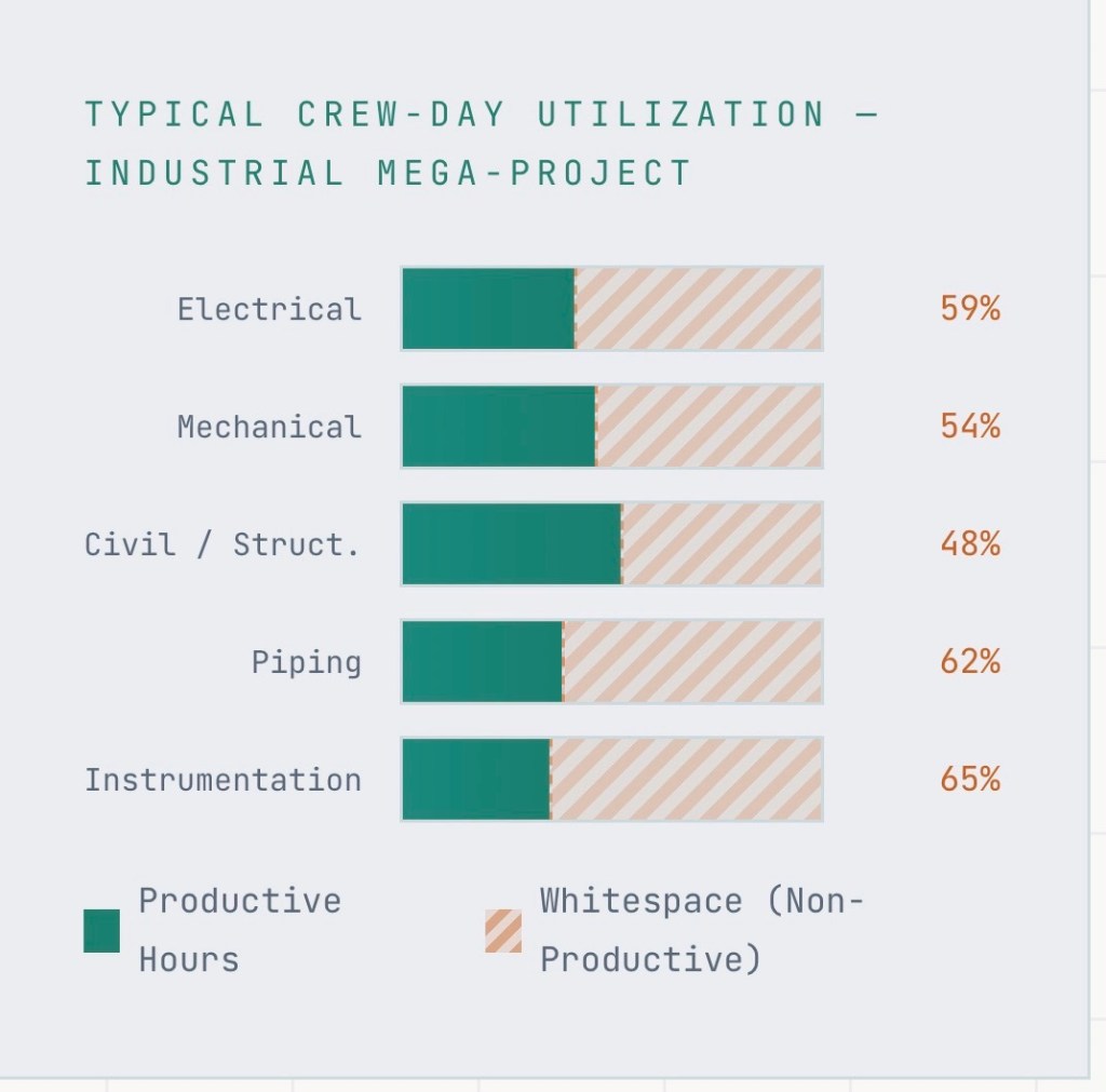Look at that chart. On a typical industrial project, more than half of every crew-day is whitespace. Instrumentation crews, the ones doing the most coordination-dependent work routinely lose two-thirds of their available hours. And yet nobody on the project team has “whitespace” in their job title, their KPIs, or their morning standup agenda.